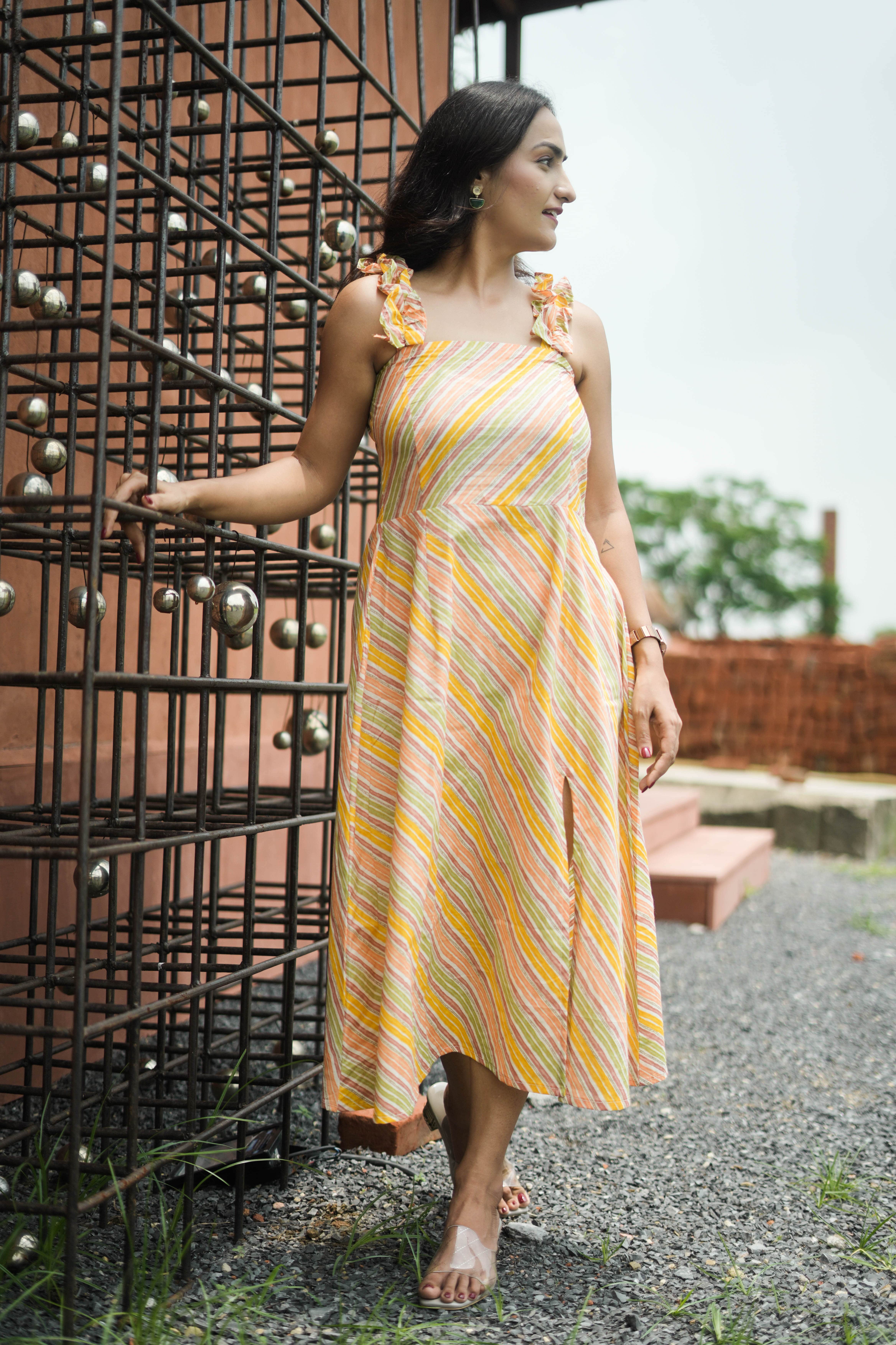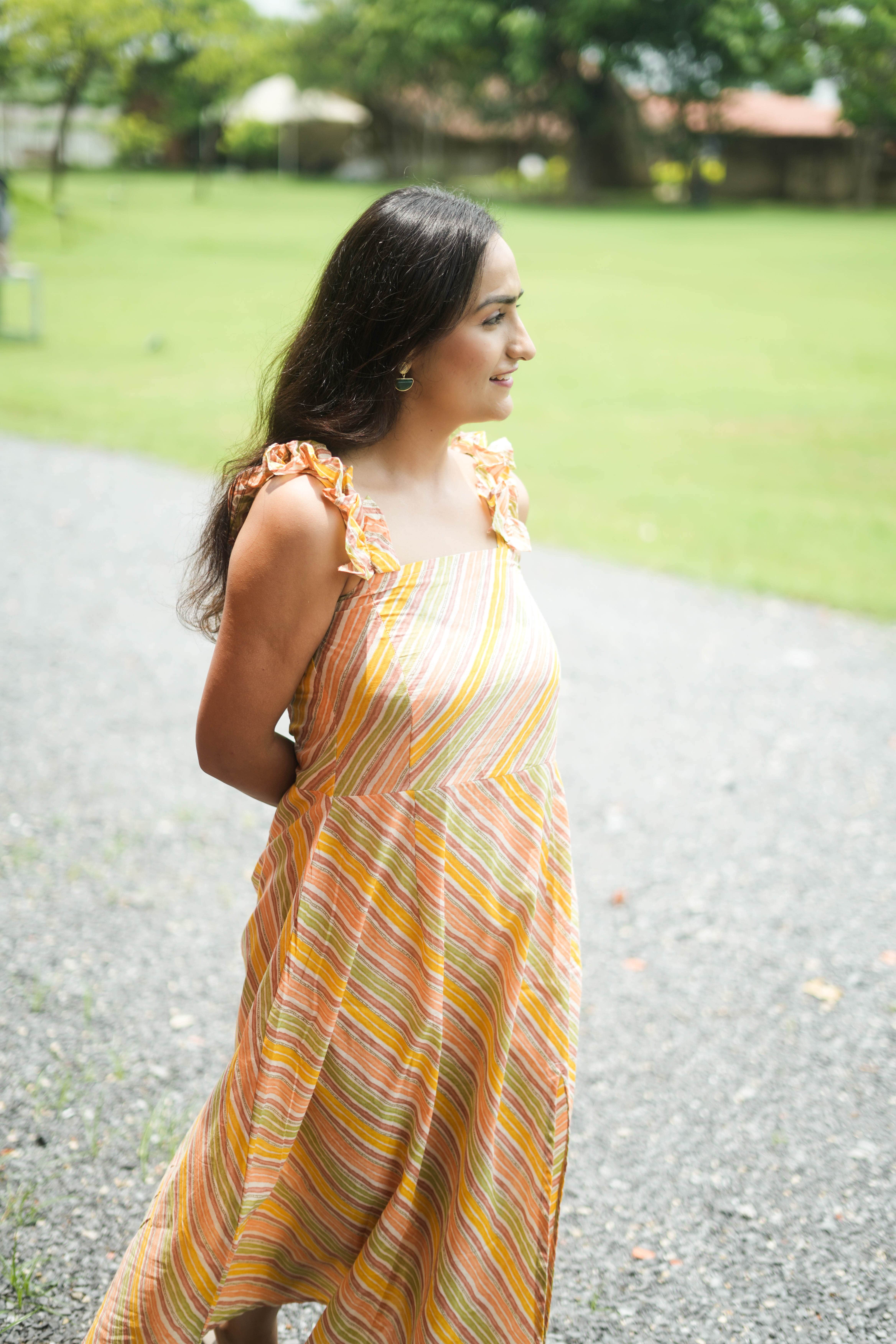 The Sana Dress is a burst of joy in the form of a stunning yellow silhouette. Designed with delicate frills on the shoulders and a playful slit on the left side, it’s equal parts feminine and fun. Flowing effortlessly with every step, this dress feels like wearing sunflowers on a warm, happy day.