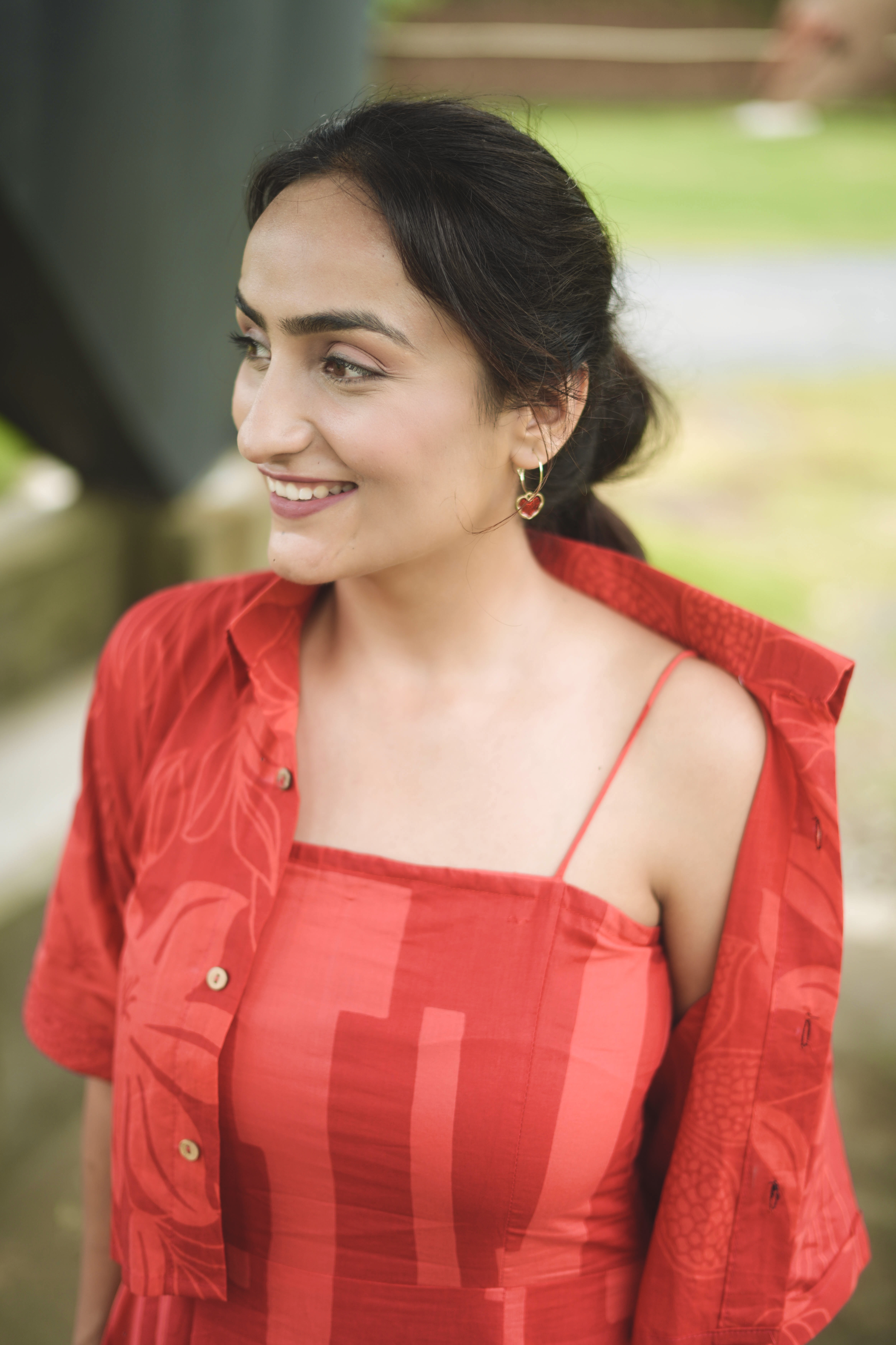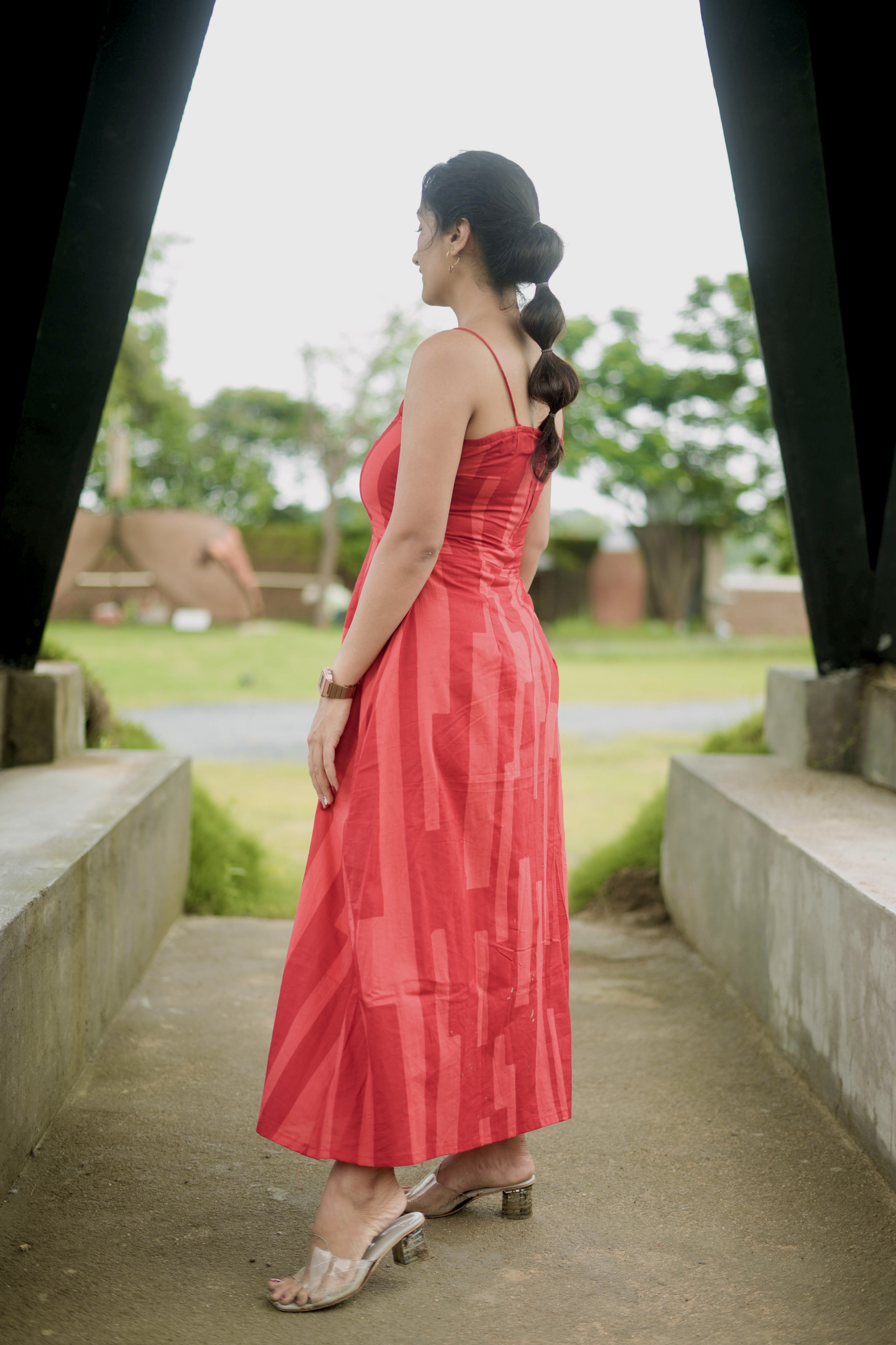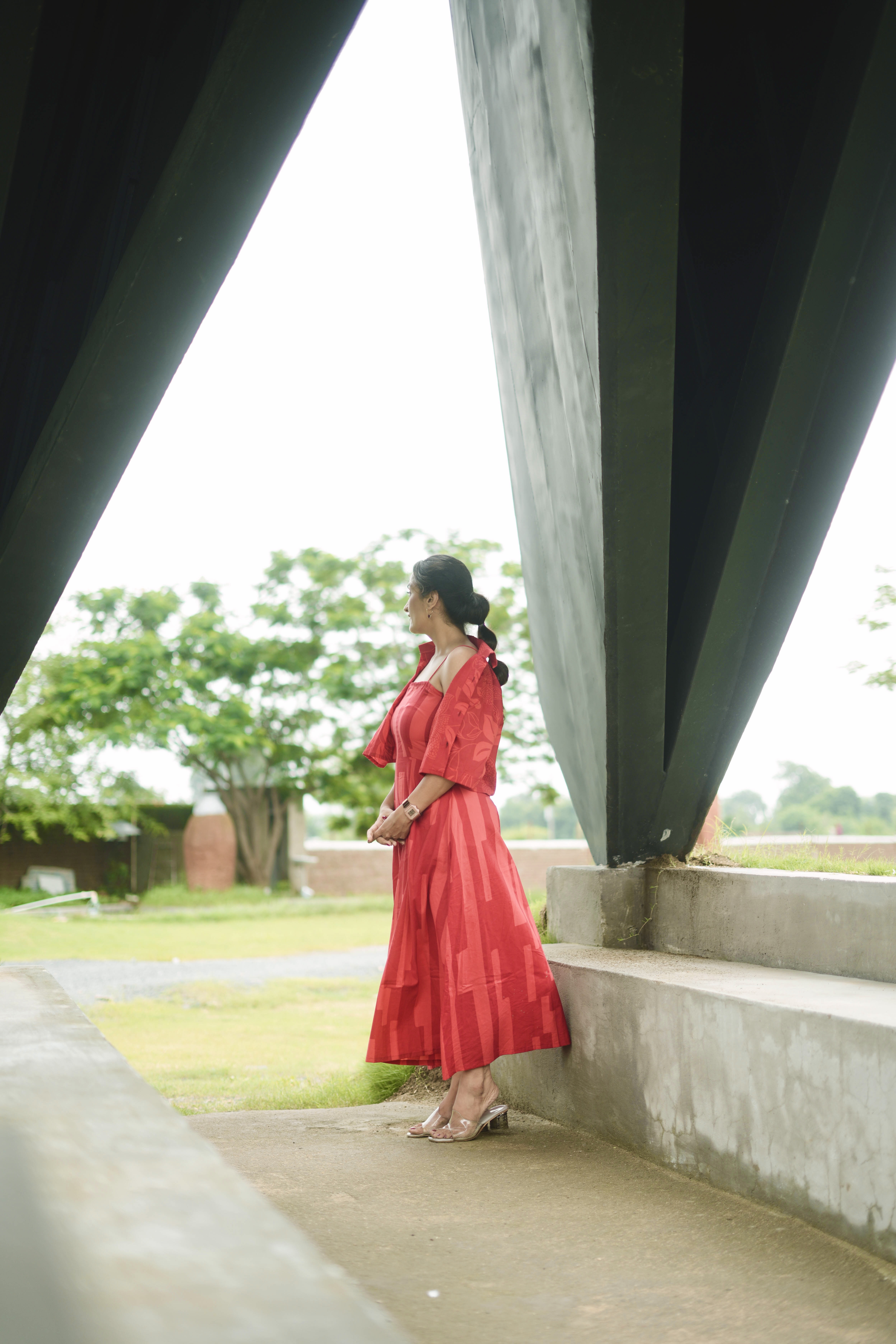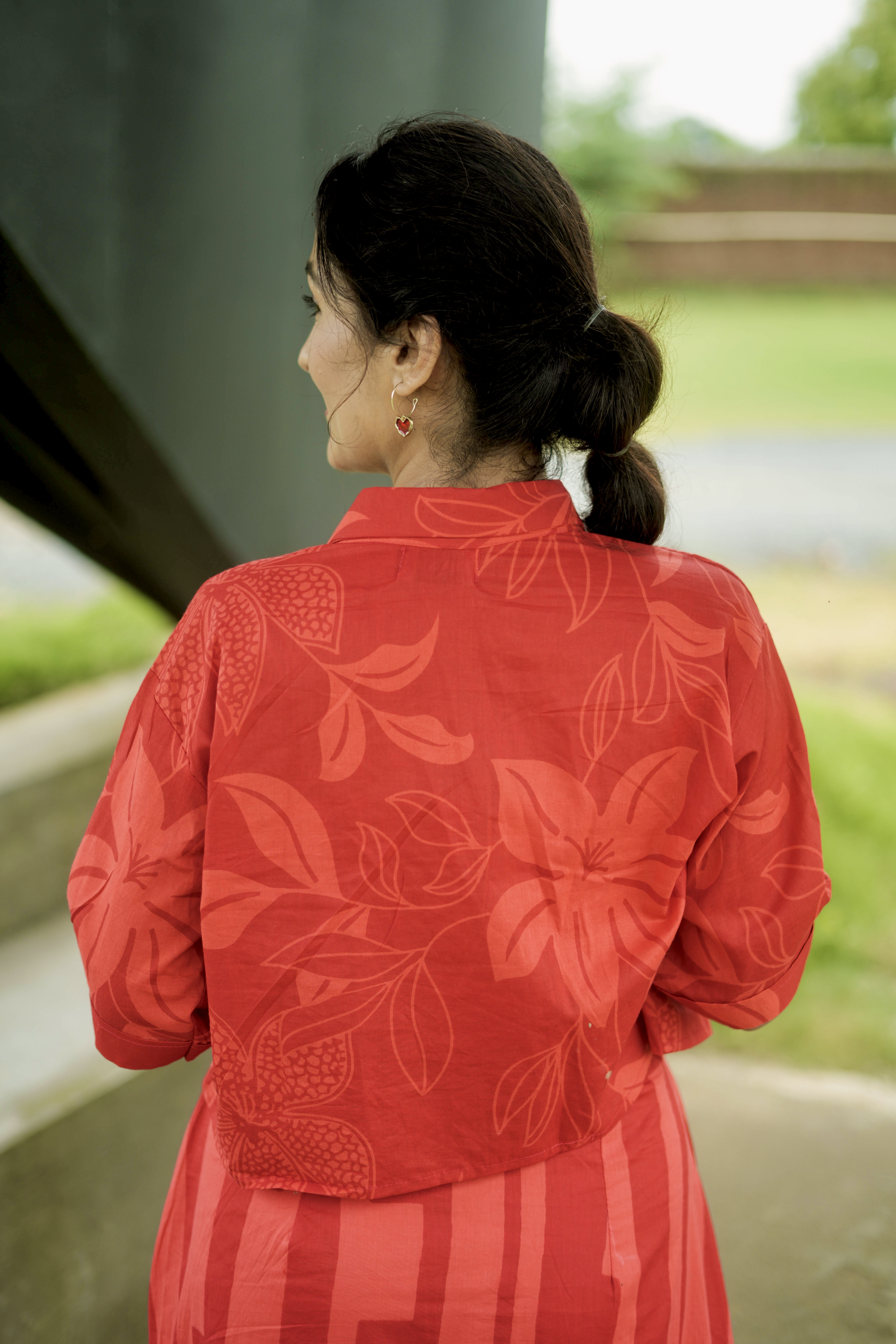 The Serena Dress is all things pretty and playful—a stunning red long dress that flows like a breeze and turns heads effortlessly. It comes with a matching crop shirt that adds a layer of versatility—wear it tied up, buttoned, or open for a relaxed vibe. With its flattering silhouette and movie-scene charm, Serena is made for twirls, dates, and dreamy days out.