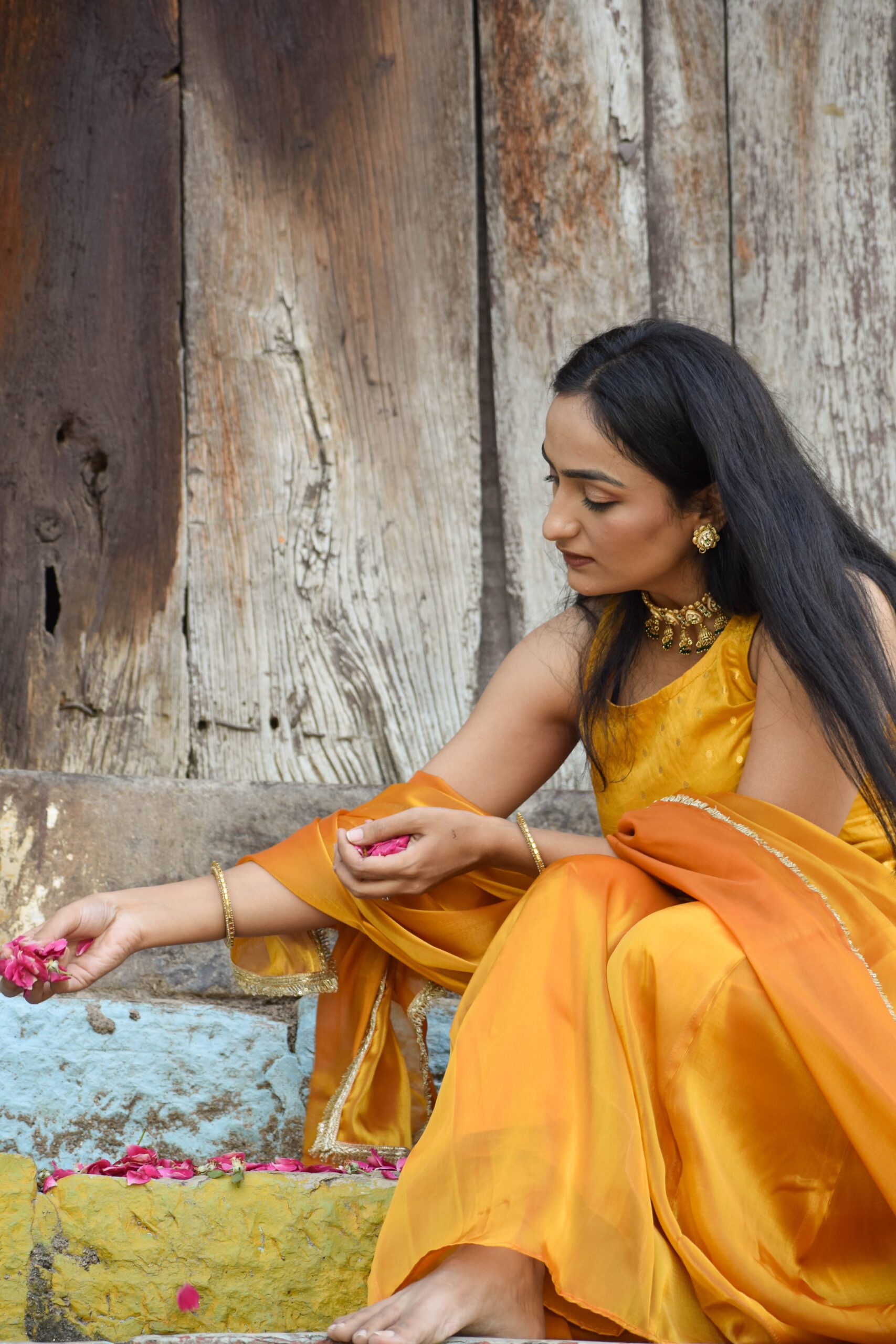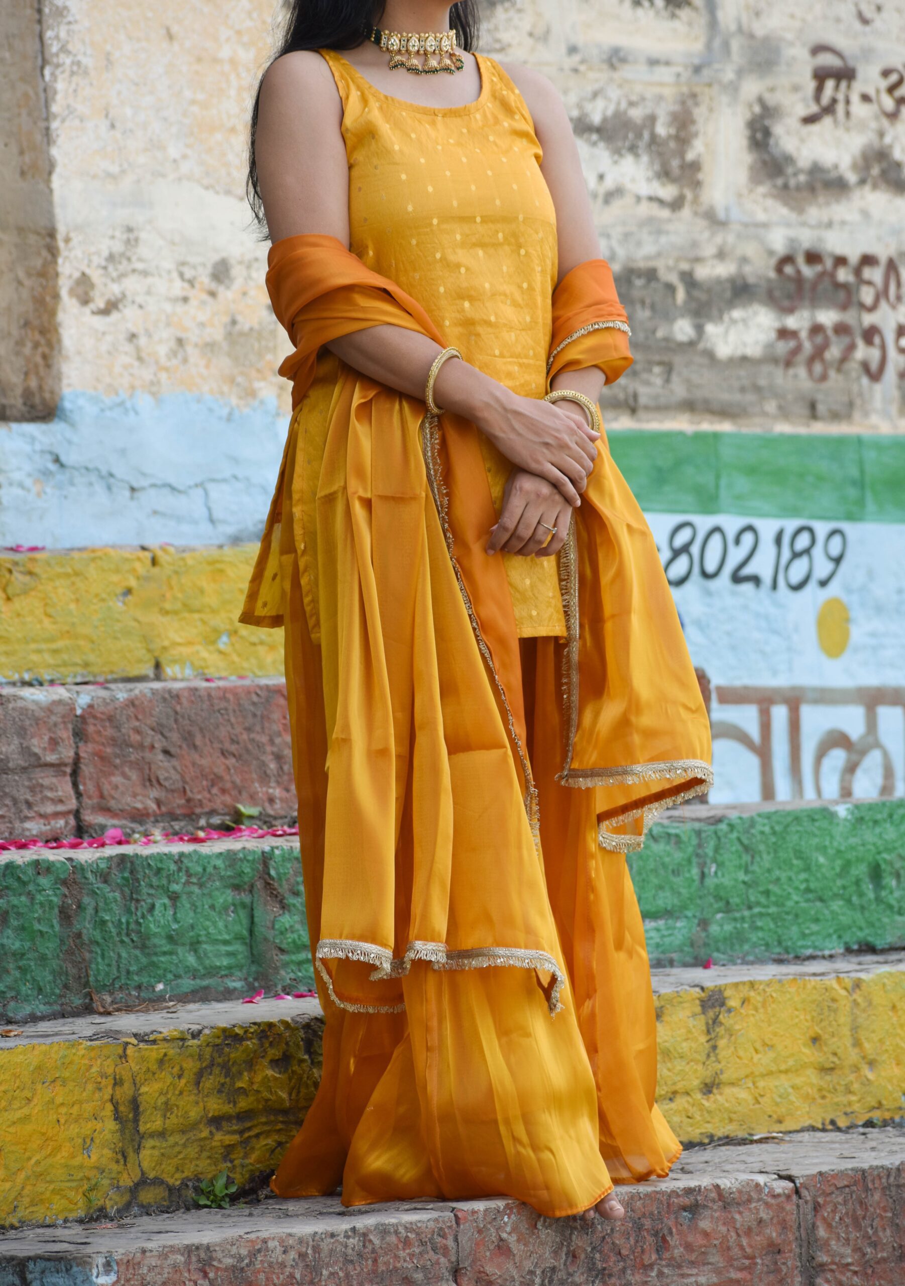 The combination of these two premium fabrics creates a perfect balance of sophistication and ease. Paired with a matching dupatta, this yellow Sharara suit is designed to make you shine at any festive occasion.